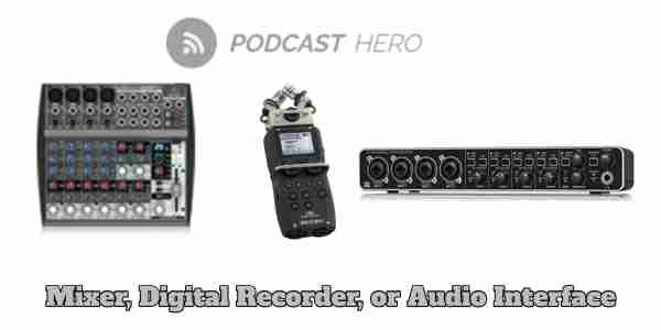 The decision between a mixer (mixing board), digital recorder, or an audio interface.