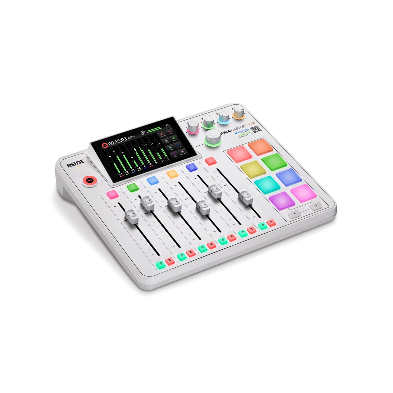 The RØDECaster Pro II is a top-tier all-in-one audio production solution designed for podcasters, streamers, gamers, musicians, and content creators. It showcases four high-quality combo inputs with ultra-low-noise, high-gain Revolution preamps for exceptional audio clarity, along with advanced APHEX processing to enhance sound quality.